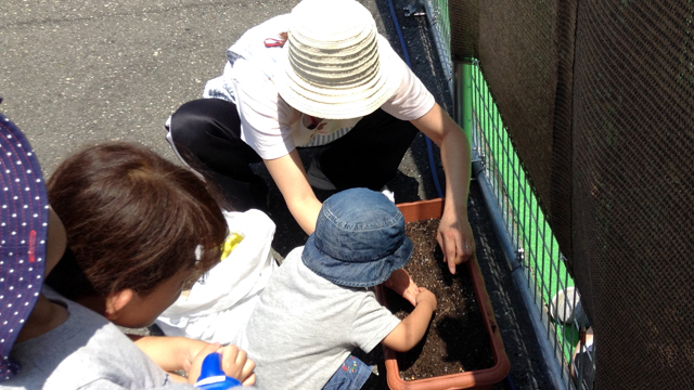 あさがおの種をまきました。プランターに用意された土に指で穴を開け、種をまいて、土をかけます。初めてで嫌がったり、困ったりするこども達かなと思っていた先生たちをよそに、おおむね、みんな、土をよく触り先生と一緒にたねまきをすることが出来ました。上手に穴に種を入れることが出来た子、外にはみ出してしまった子もいましたが、少々先生がお手伝いをして無事に種が土に収まりました。あさがおが咲いた後は色水遊び、押し花等として遊びます。