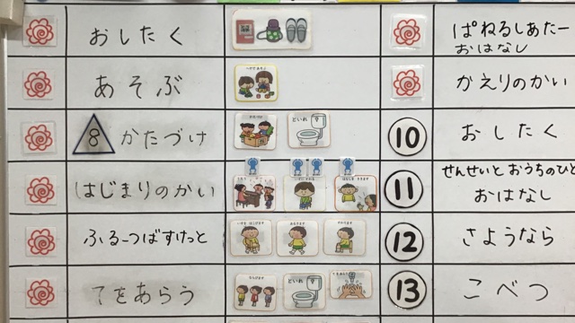 ぱっそでは、活動が終わるたびにホワイトボードにはなまるを付けていきます。先生が説明をしながら、はなまるを付けることで自分達の行動のどこが良かったのかが明確になります。はなまるをもらえることが、やる気や楽しみにつながり、話を聞くときや起立、着席のときなど、その都度ポイントを意識しながら行動する力が身についていきます。(ぱっそ鷹匠教室))
