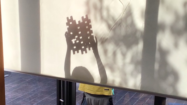 ロールスクリーンに自分の影がうつっていることに気が付いたA君。ブロックをロケットや月に見立てて、影絵を楽しんでいました。子どもたちの「気づき」「やってみたい」「こうしてみよう」を大事にしていきます。(ぱっそ音羽町教室)