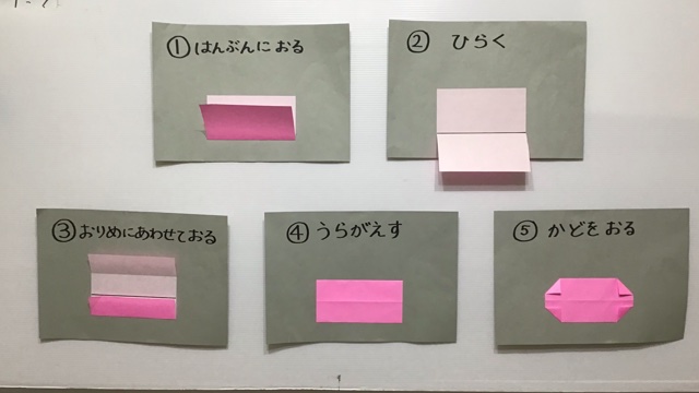 今回の折り紙は、初めに完成までの工程を見て、その後自分で手順表を確認しながら折りました。前に大きく表示し少し離れた所にある手順表を見たり、手元に手順表を置いて見るなど、個々に合った段階を踏んで見る力を育てていきます。(ぱっそ音羽町教室)