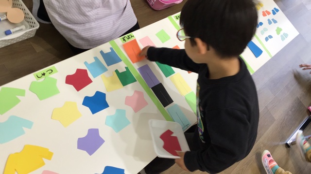 「着せ替え」を題材として、男の子だから、女の子だからにとらわれず、様々な「形」「色」の中から自分の好きなものを選びました。素早く選び出したり、じっくり考えて選んだり、一度手にしてからまた選び直したりと、好きなものに対する思いも様々です。周りの人に影響されずに、自分で好きなものを選ぶことを大切にして欲しいです。(ぱっそ音羽町教室)
