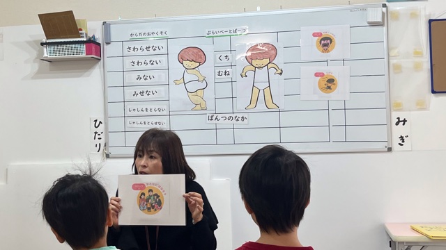 今年度も、カレッジまどか学長の國分聡子先生による性教育を行いました。子どもたちには主に、身体の大事な部分「プライベートパーツ」について教えていただきました。保護者には、プライベートパーツに加え、性被害・性加害に遭わないために今からできることや、性器の洗い方などをお話ししていただきました。性教育は幼児期から始まっているため、子どもの性について考える良い機会となりました。(ぱっそ音羽町教室)
