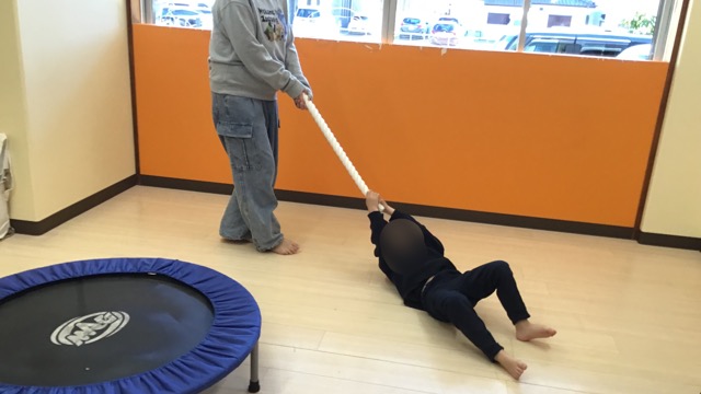 今週の粗大運動では、背泳ぎ引っ張りを行いました。日頃「引っ張る」という動作をする場面はあまり多くないかもしれませんが、両手でしっかりとひもを握る、足で踏ん張るなどいくつかの運動動作が必要になります。また、両腕を上げて「バンザイ」をする動作は、正しい姿勢を作っていくことや、着替えがしやすくなる、投げる動作につながるなど、生活や運動に直結する大切な動きです。(ぱっそ大和教室)