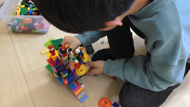 ブロックでビー玉を転がすコースターをつくることが大好きなお子さん。「つくりたい」と思ったものを自分で決めて形にしていく中で、手先を器用に使う力・見通しを立てる力・想像力などが育っていきます。試行錯誤を繰り返しながら、「つくりあげた」ことによって成功の喜び、認められた嬉しさなどを感じ、自己肯定感が育ちます。(ぱっそ大和教室)