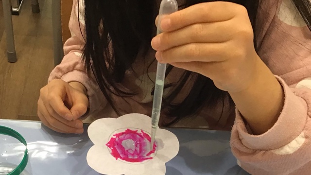 スポイトを使ってにじみ絵をやりました。自分で色を塗ったお花の上に、1滴ずつ垂らしていきます。ぎゅっと力強く押すと水が勢いよく出てしまうことを、実際にやってみることで体感し、自分で力加減をしながら操作をしていました。「知っている」ことや「もっとやりたい」ことを増やし、物事に意欲的に取り組むために、初めてのことや日常生活では少ない経験を、活動内容に取り入れていきます。(ぱっそ音羽町教室)