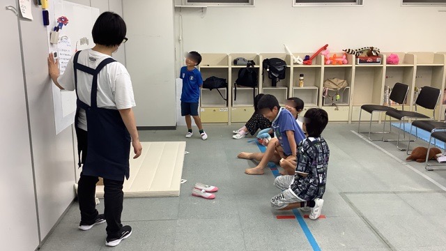 1文字ずつ文字を覚えてもらって、みんなで言い合いどんな言葉ができるのか考えるゲームをしました。どんな言葉になるのか想像して並び、1人ずつ覚えた文字を言っていき答え合わせをしました。正解した時は大喜び!みんなの知識や協力が形になった瞬間でした。