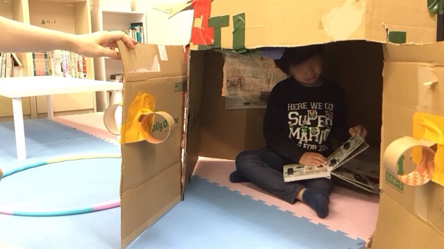 中学生のお兄さんが、段ボールハウスを作ってくれました。なかなかの大作です。 これが小学生たちに大人気!壊れてしまう事を心配していましたが杞憂だったようです。 ドアを閉めると真っ暗になるわけではなく、少しだけ明かりが入ってくるのも人気の理由なのかもしれません。一人で過ごすのにもちょうど良いようです。