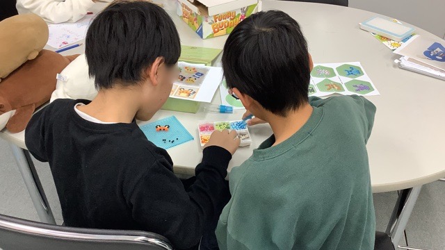 教室のひとこまじっくり作る2025/12/22 アクアビーズでお気に入りのキャラクターを作っています。ビーズの数を正確に数えたり位置関係を確認したりと細かい作業が多いですが、子ども達は器用に作り色を入れ変えるなど応用も利かせていました。